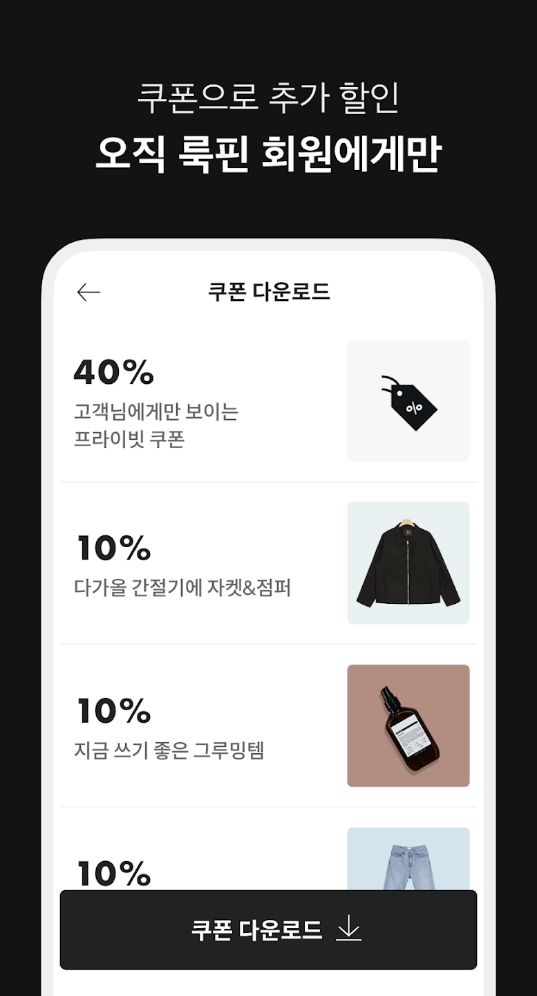 - 멤버십 혜택 : 룩핀의 회원이 되시면 할인 쿠폰을 비롯한 다양한 혜택을 누릴 수 있습니다. 로그인하여 쿠폰을 다운로드하고 최고의 할인 상품을 찾아보세요.