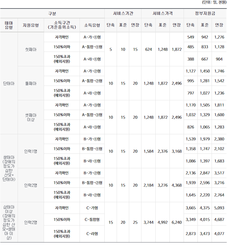 - 태아의 유형, 출산 순위, 서비스 기간 선택 등에 따라 바우처 지원기간 차등 지원